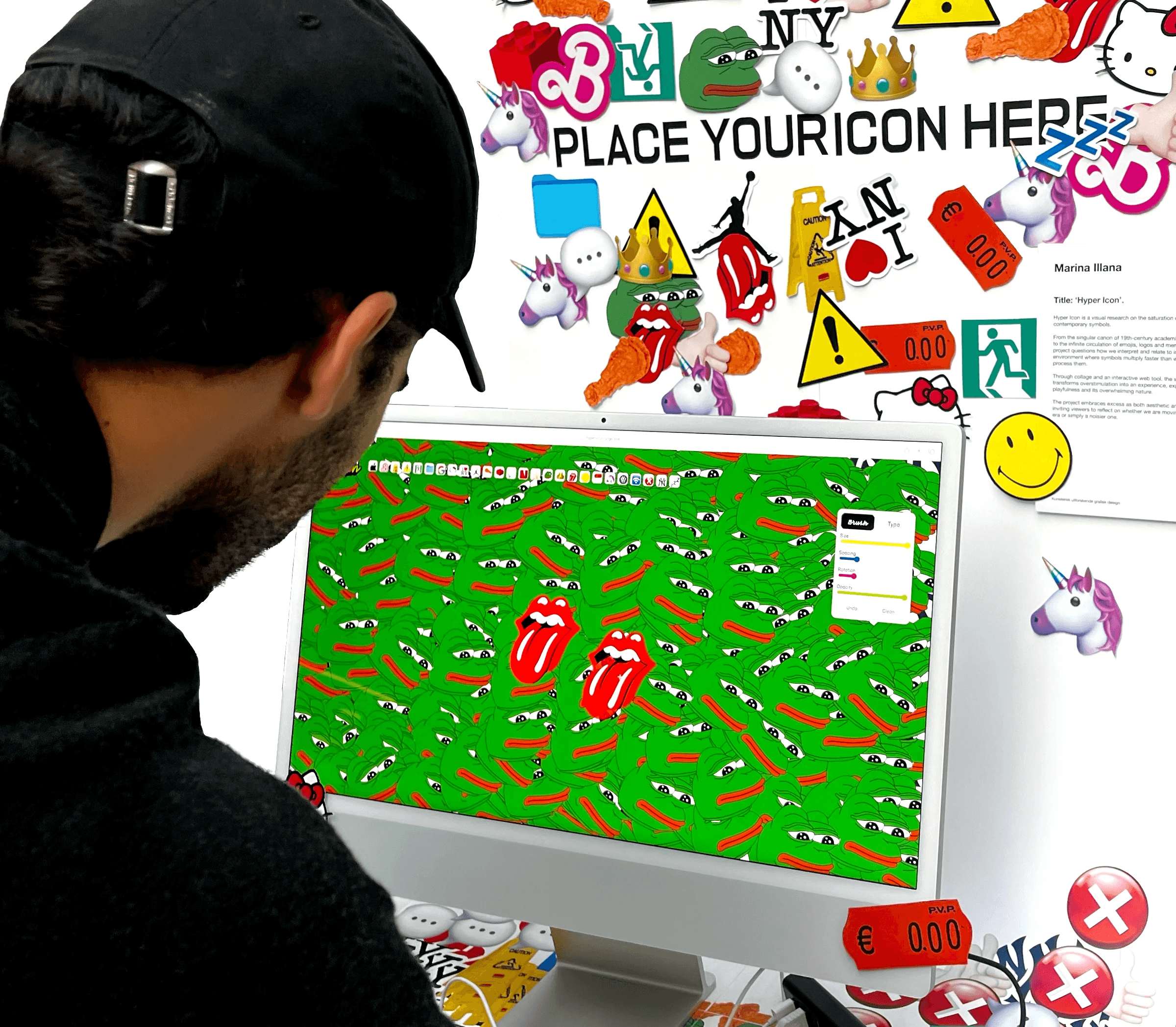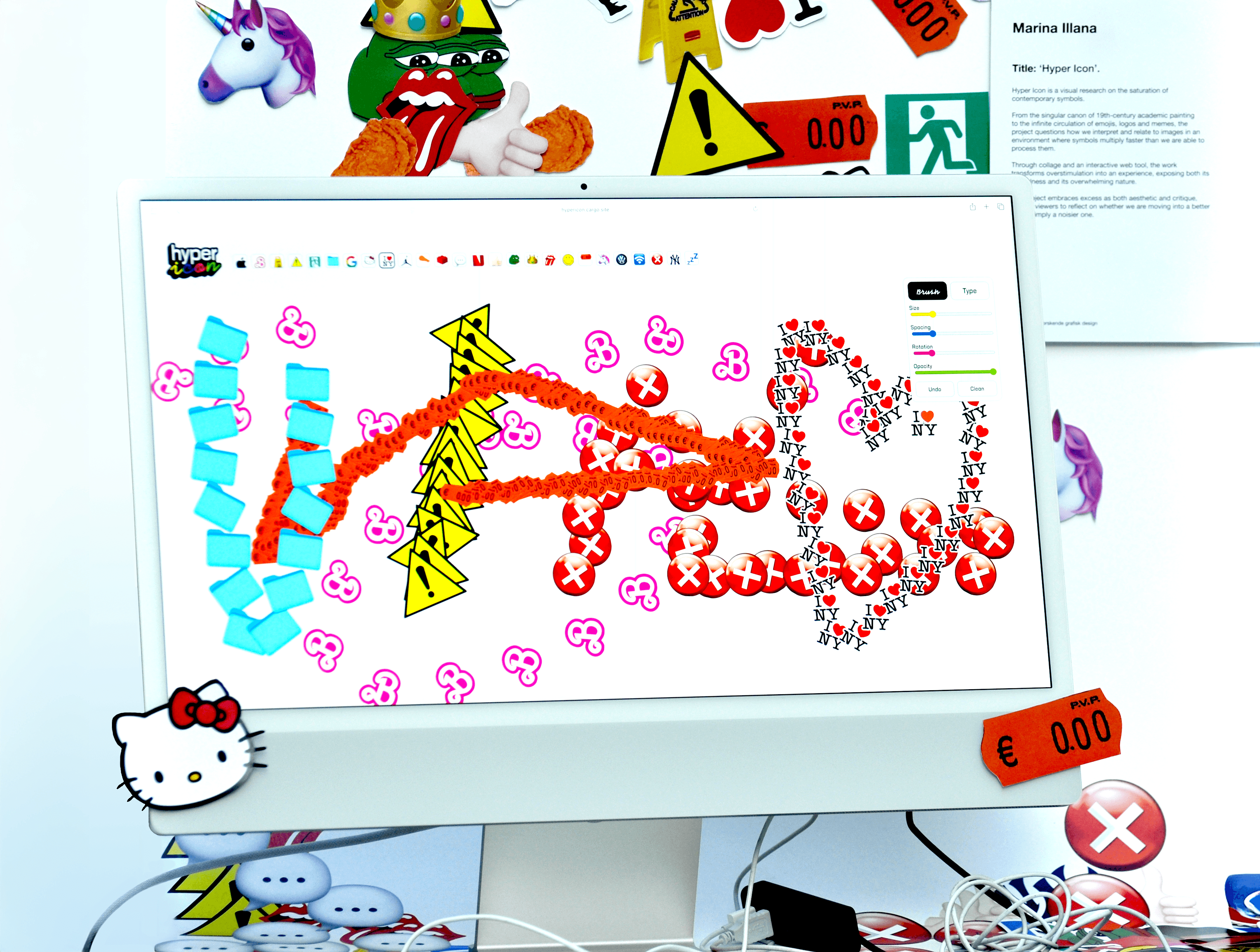 The tool includes two modes Brush and Type inviting users to create chaotic visual layers or compose text with an alphabet built from everyday icons. Using the tool, I generated a collection of posters, each embracing saturation, noise, and visual excess as deliberate design strategies. These outcomes extended into print and installation: a flipbook translating digital overload into motion, a wall to paste sticky icons, and the interactive tool itself as part of the exhibition. Instead of offering a single conclusion, the project turns symbolic overload into an experience, one that invites viewers to question how we navigate a world saturated with signs, and what this reveals about our collective identity.
